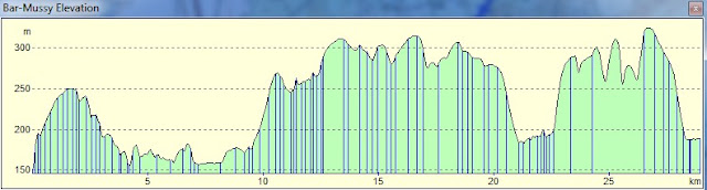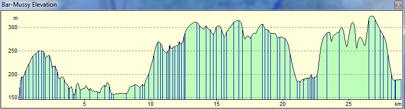 Un peu d'angoisse ce matin , d'abord il faut se lever tôt ( enfin relativement ) pour être parti à 8h30 car l'étape fait 30km , mais surtout il y a près de 800m de dénivelé positive ( pour a peu près 750 de négative) et la côte 300m va être franchie plusieurs fois , comme l"indique ce graphique issu de mon logiciel de navigation favori (Memory-Map ) .