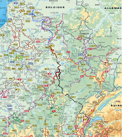 Version initiale : Nord/est via Meuse , Vosges / Doubs / Jura . 720 km environ de Reims(51) aux Rousses (39) , 27j , 6 semaines . Dénivelés importants dans Vosges / Jura , étapes plus courtes . Hébergements et itinéraires compliqués sur le GR714 & GR14 , probablement très peu fréquentés . La partie Jura ( Grande Traversée du Jura GR5 et GTJ ) semble par contre très fréquentée et organisée et en plus d'une très grande richesse touristique .On peut zapper entre Belfort et Montbéliard sans état d'âme ( gain 1j, 30km et gares de chaque côtés )